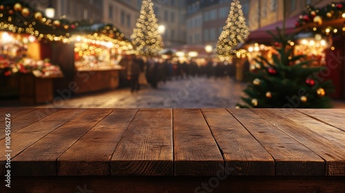 A festive wooden table in front of a blurred Christmas market with lights and trees.