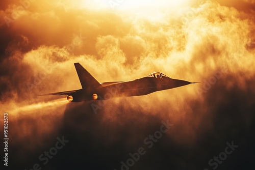 A fighter jet flies through the clouds with rays of sunshine in the background