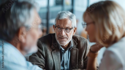 A financial advisor conducting a retirement planning session with a senior couple, discussing long-term investment strategies.