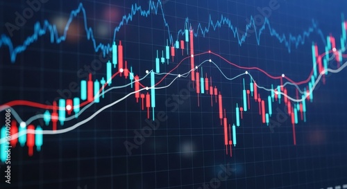 A financial stock market chart with red and blue candlesticks