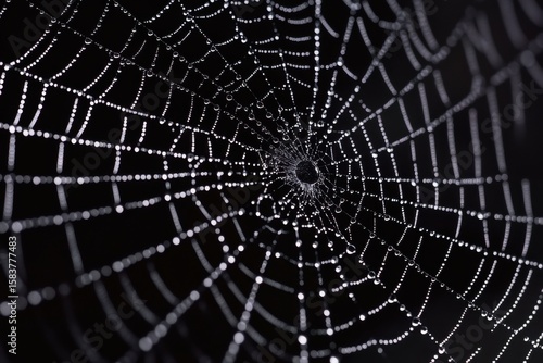 A finely woven spider web displays intricate patterns, glistening with tiny dew droplets