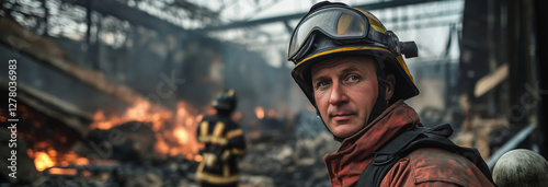 a firefighter wearing a helmet, with another fireman behind him at the scene inside a factory building that has been completely destroyed.