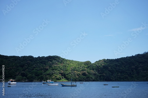 A fisshing boats are standing on the small river close to Bertioga Brazil on a sunny day before the hills with green woods, wild nature life