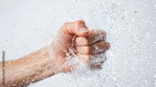 A fist clenches through a burst of water, creating a dynamic splash of droplets.