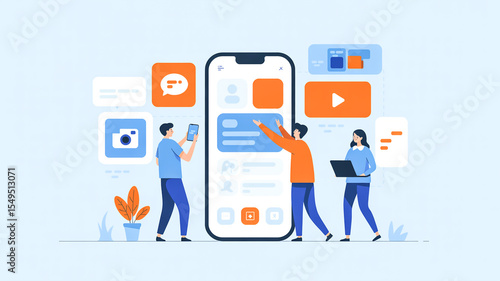 A flat design illustration of a mobile app interface concept with three small figures interacting with a large smartphone screen