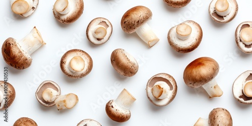 A flat lay of fresh mushrooms on a white background, showcasing their natural textures.