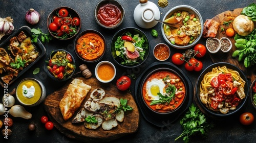 A Flat Lay of Various Dishes and Ingredients on a Black Surface