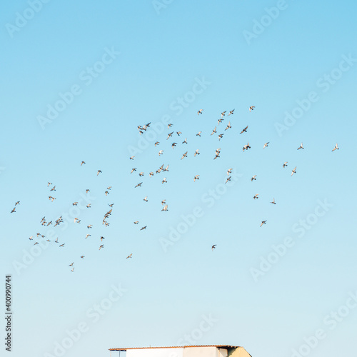 A flock of birds flying in the blue sky