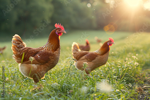 A flock of chickens roam in green paddock. Free range chicken on traditional poultry farm. Organic farming, back to nature concept