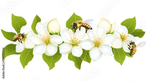 A floral arrangement featuring bees and white blossoms with green leaves.