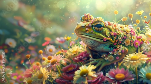 a Flowered Frog hiding in a colorful garden, where it blends seamlessly with the blooming environment.