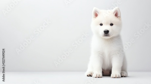 a fluffy Akita Inu puppy sitting obediently, soft pastel colors, gentle and calm, isolated on white background