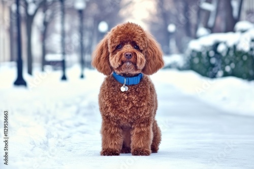 A fluffy brown dog with curly fur is sitting on a snowy pathway, wearing a vibrant blue collar, surrounded by a serene winter landscape and street lamps.