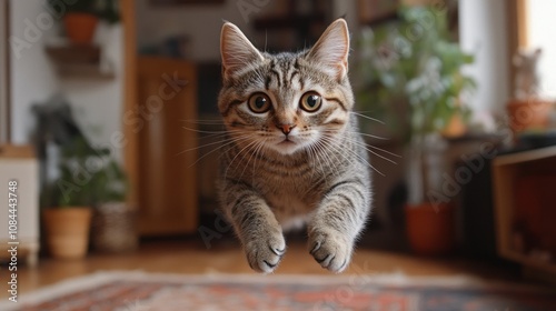 A fluffy tabby cat leaps through the air, showcasing its playful nature in a warm, inviting living space.