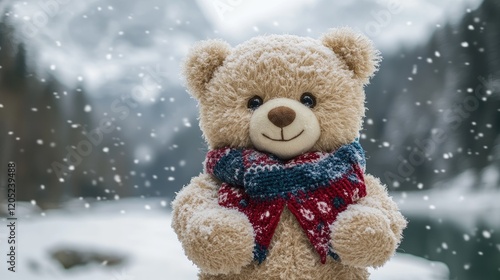 A fluffy teddy bear wearing a cozy scarf stands in a snowy landscape with mountains in the background