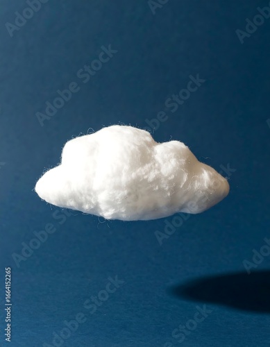 A fluffy white cloud-like object floats against a deep blue backdrop, casting a subtle shadow