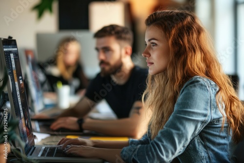 A focused group collaborates in a contemporary workspace, engaging with computer tasks and sharing ideas throughout the day. Generative AI
