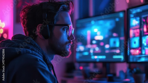 A focused individual wearing headphones is engaged in work at dual monitors, illuminated by vibrant blue and pink lighting.