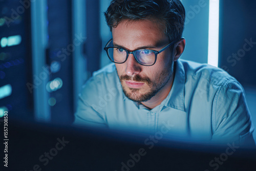 A focused man wearing glasses works intently on a computer in a dimly lit, tech-driven environment.