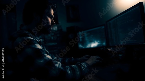 A focused programmer works late into the night coding on multiple monitors in a dimly lit room bathed in screen light