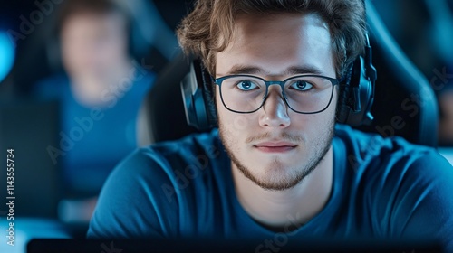 A focused young man with glasses, immersed in gaming, wearing headphones, sits in a dimly lit environment with others in the background.