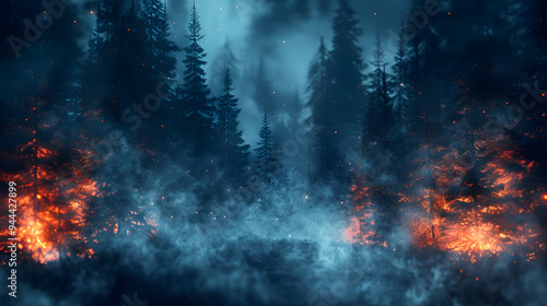 A foggy forest where 2D mist blends into 3D trees, captured with a shallow depth of field to create a mystical effect.