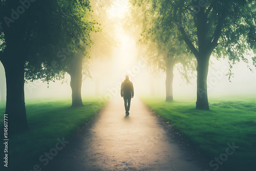 A foggy park path lined with trees