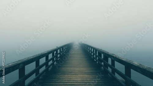 A foggy pier stretching into the distance, with muted colors and a serene, contemplative atmosphere