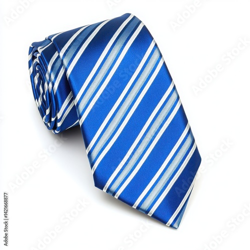 A folded blue necktie with white stripes on a white background close up view