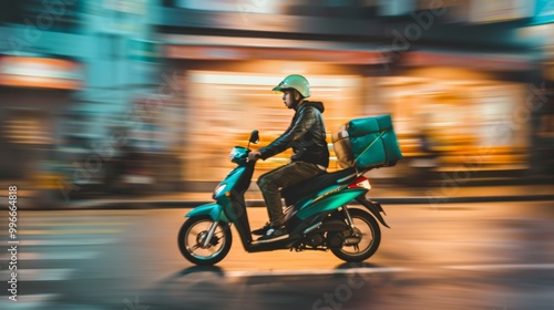 A food delivery rider on a scooter speeds through the city streets at night, capturing the fast-paced urban lifestyle