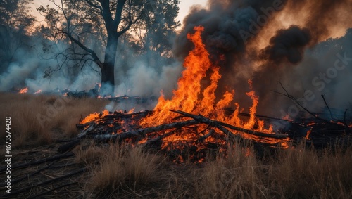 A forest fire scene with flames and smoke, burning trees and debris in a natural landscape.