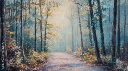 A forest path, where the leaves are coated in a layer of rain, their vibrant colors muted by the soft pastel light filtering through the trees. The rain continues to fall lightly, creating a rhythmic