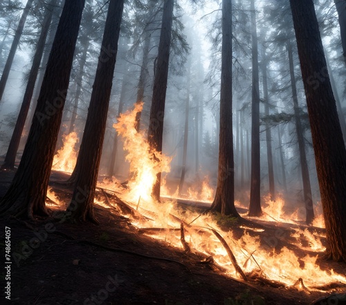 A forest under siege by fire, the flames illuminating the twilight sky with an eerie glow, as smoke veils the trees. AI generation