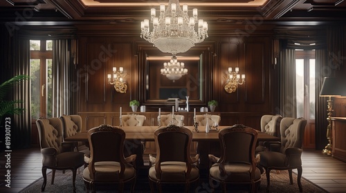 A formal dining room with a grand wooden table, upholstered chairs, and a crystal chandelier overhead.