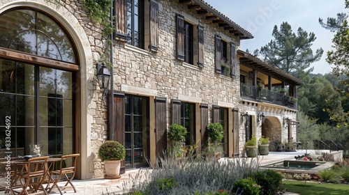 A French country house design with stone facades, charming shutters, and a rustic yet elegant interior