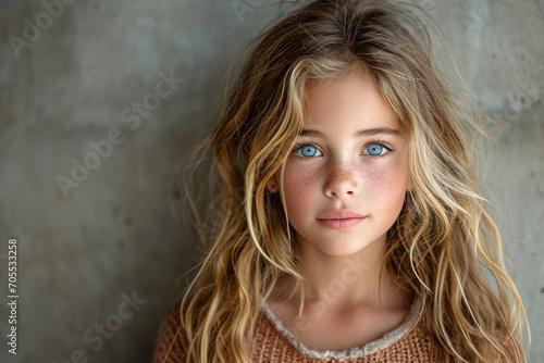 A fresh and lively portrait capturing the beauty and energy of a young girl in her student age, set against a neutral background, creating a visually vibrant and charming 3:2 compo
