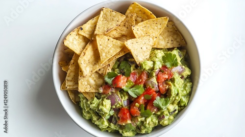 A fresh and vibrant bowl of guacamole with tortilla chips, set on a clean white background,