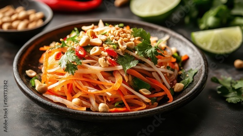 A fresh and vibrant Thai papaya salad featuring shredded vegetables, peanuts, and lime, offering a perfect blend of sweet, sour, and spicy flavors.