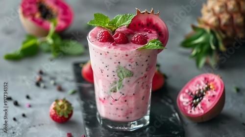 A fresh fruit and mint pitahaya shake on a gray marble table