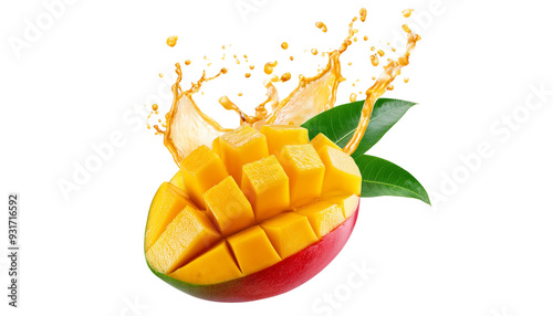 A fresh mango with leaves and liquid splattering over it, cut out