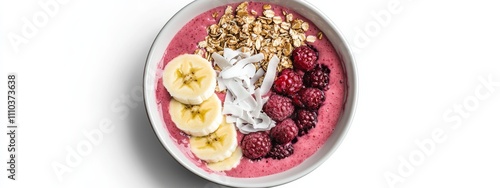 A fresh mixed berry smoothie bowl topped with granola, coconut flakes, and sliced bananas