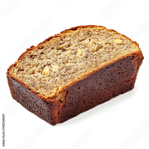 A freshly baked banana bread slice with a golden brown crust, soft moist interior, and visible banana specks