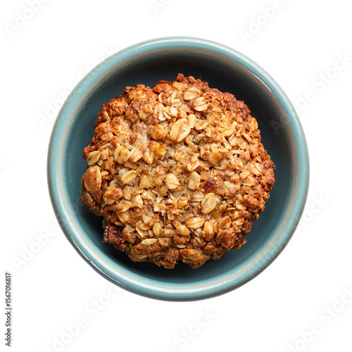 A freshly baked oatmeal cookie in a blue bowl, a culinary delight. The cookie is golden brown and the bowl has a soft, light blue hue. The scene evokes a sense of comfort and indulgence