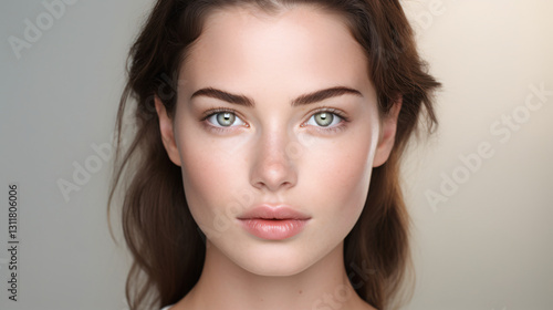 A front view medium headshot of an American female at a cosmetic skincare salon, exuding confidence.