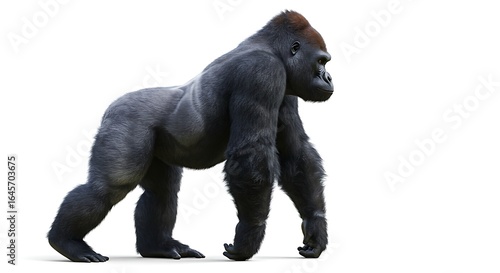 A full body shot of a gorilla walking on all fours with a white background and visible musculature