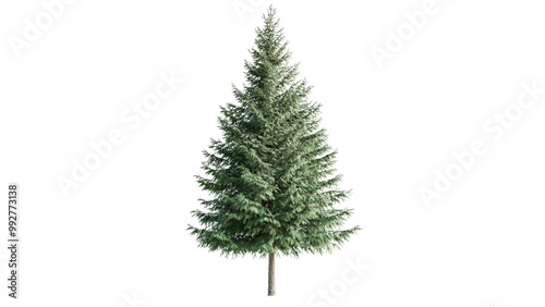 A fully grown evergreen tree, isolated and centered on a clean white surface