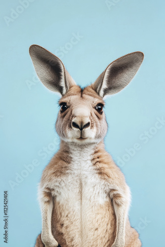 A funny and excited kangaroo isolated on a blue background, with its ears perked and eyes wide open.