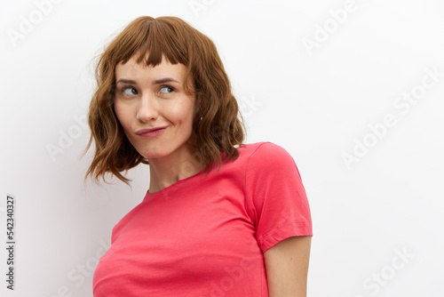 a funny, mischievous woman in a red T-shirt stands on a white background playfully looking away