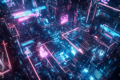 A futuristic AI-controlled city, composed of glowing cybernetic skyscrapers, floating holographic advertisements, and neon-lit energy pathways. The abstract high-tech background represents smart city