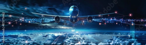A futuristic airplane flies through a digital landscape at night, with glowing lines and dots connecting the aircraft to the world below